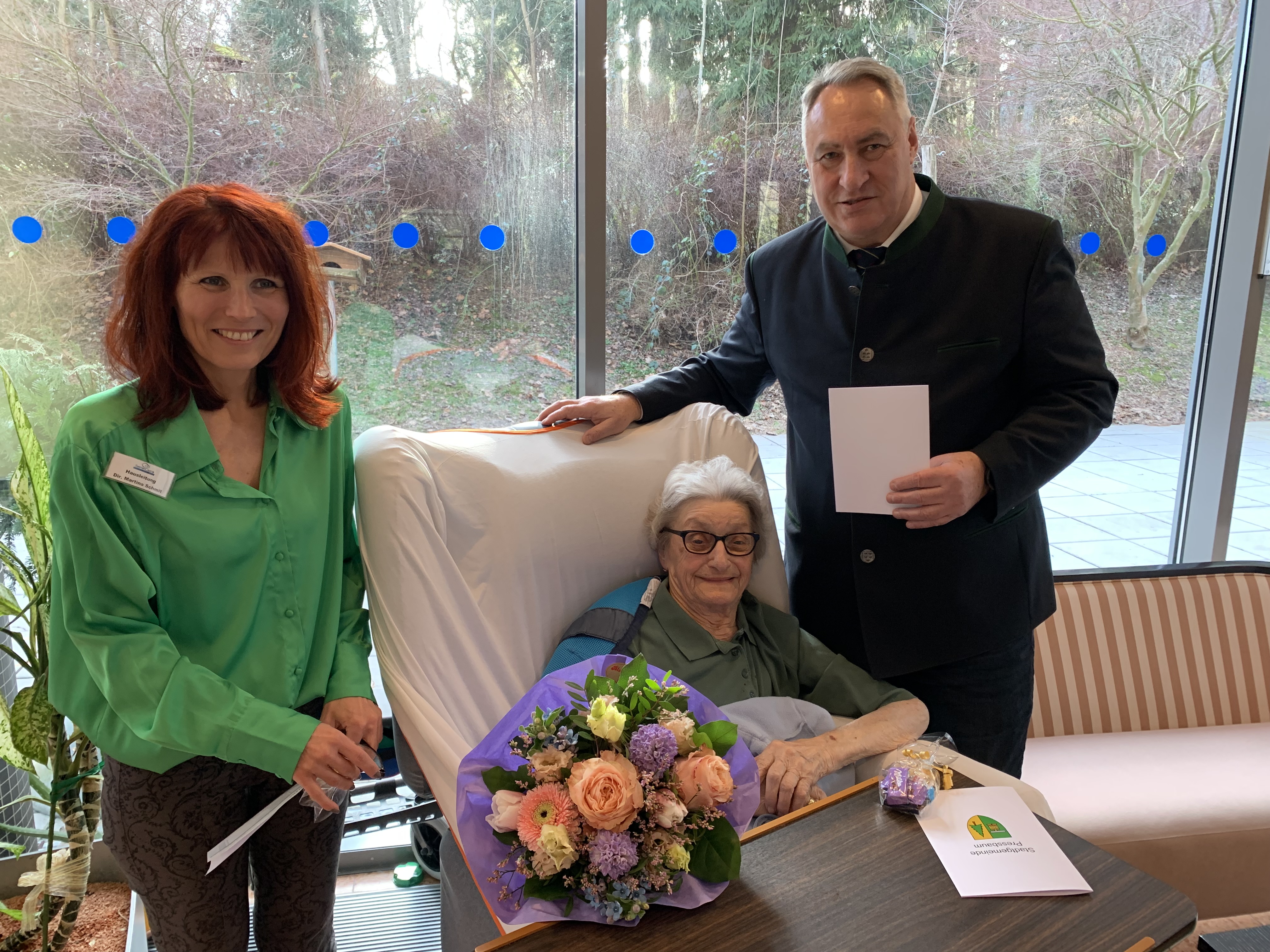 Hausleitung Martina Schmit, Bewohnerin Stegermaier Josefa, die ihren 97. Geburtstag feierte und Bürgermeister Josef Schmidl Haberleitner