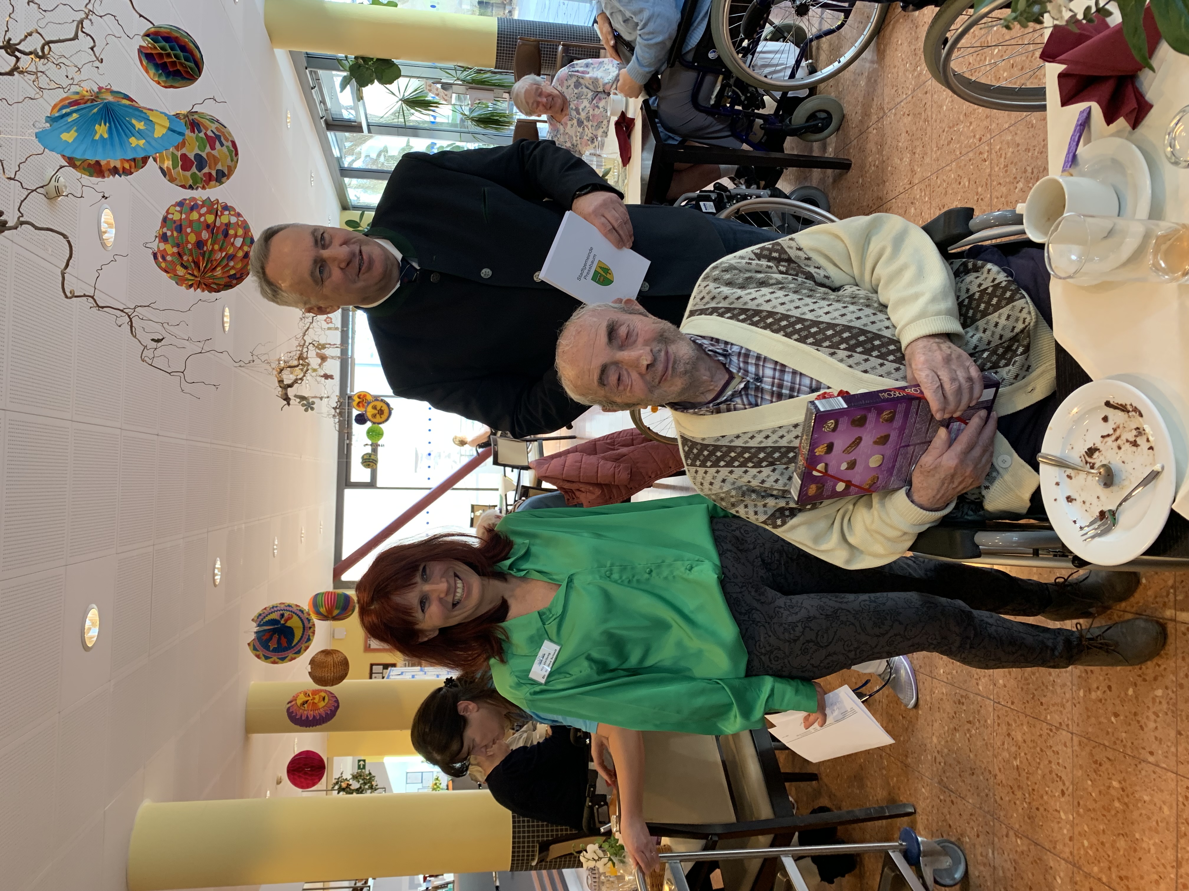 Hausleitung Martina Schmit, Bewohner Kaya Sati, der seinen 80. Geburtstag feierte und Bürgermeister Josef Schmidl Haberleitner