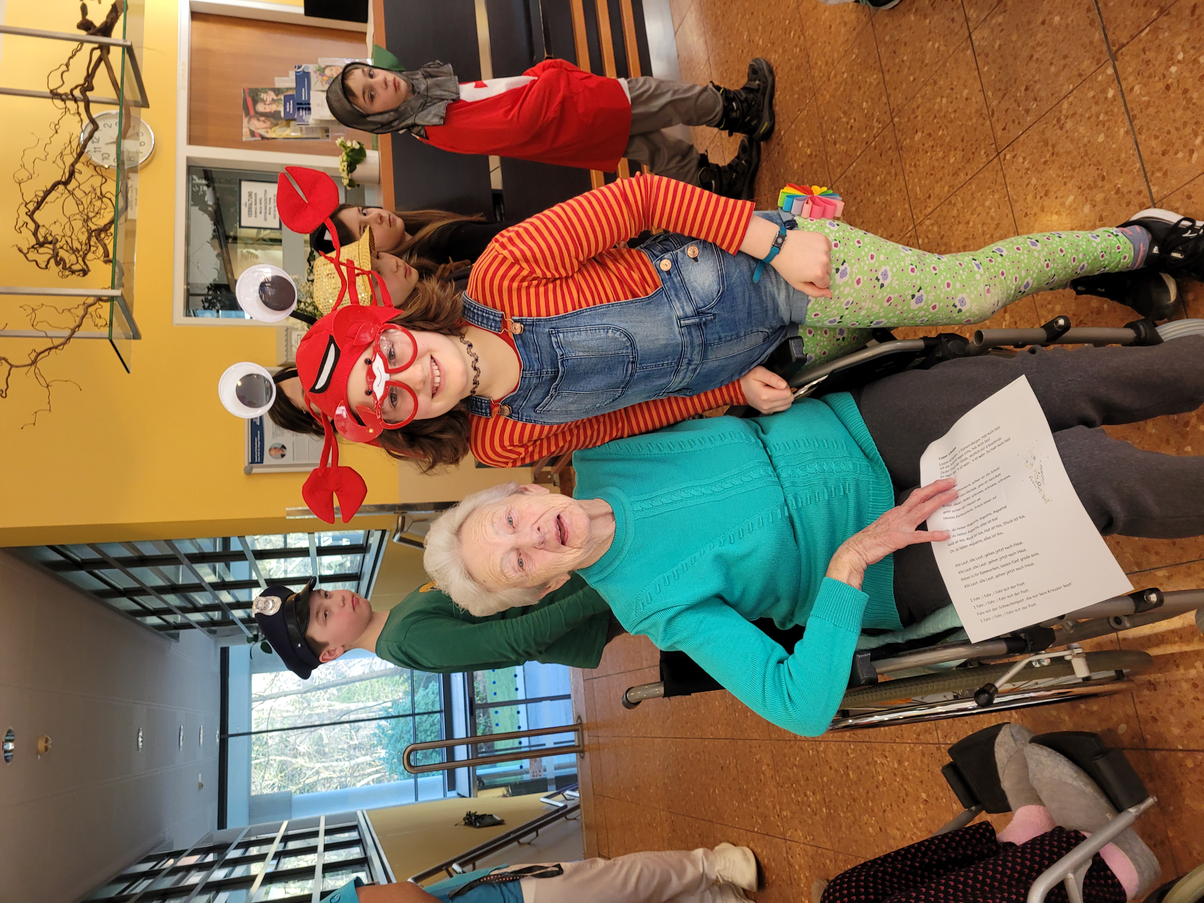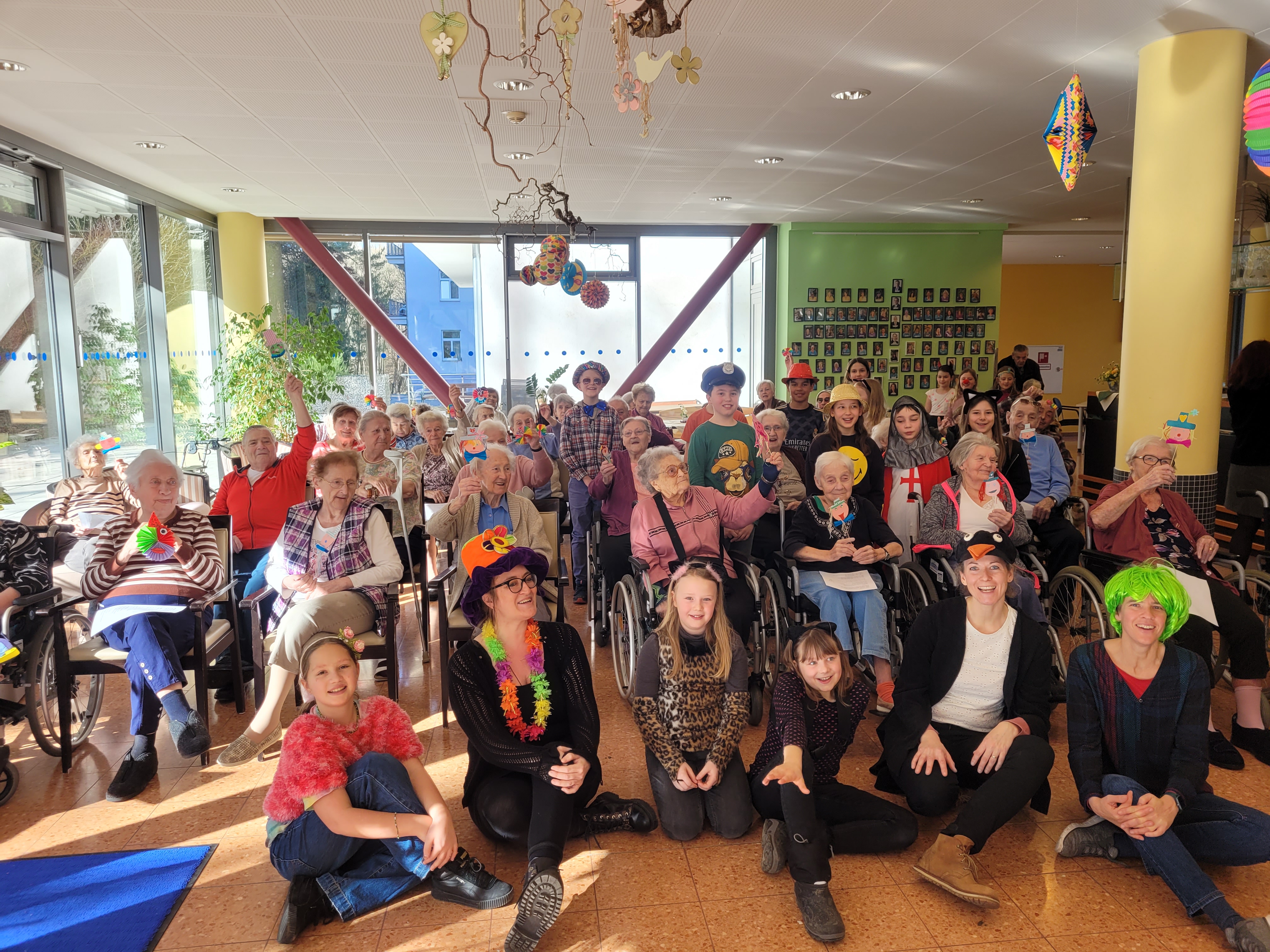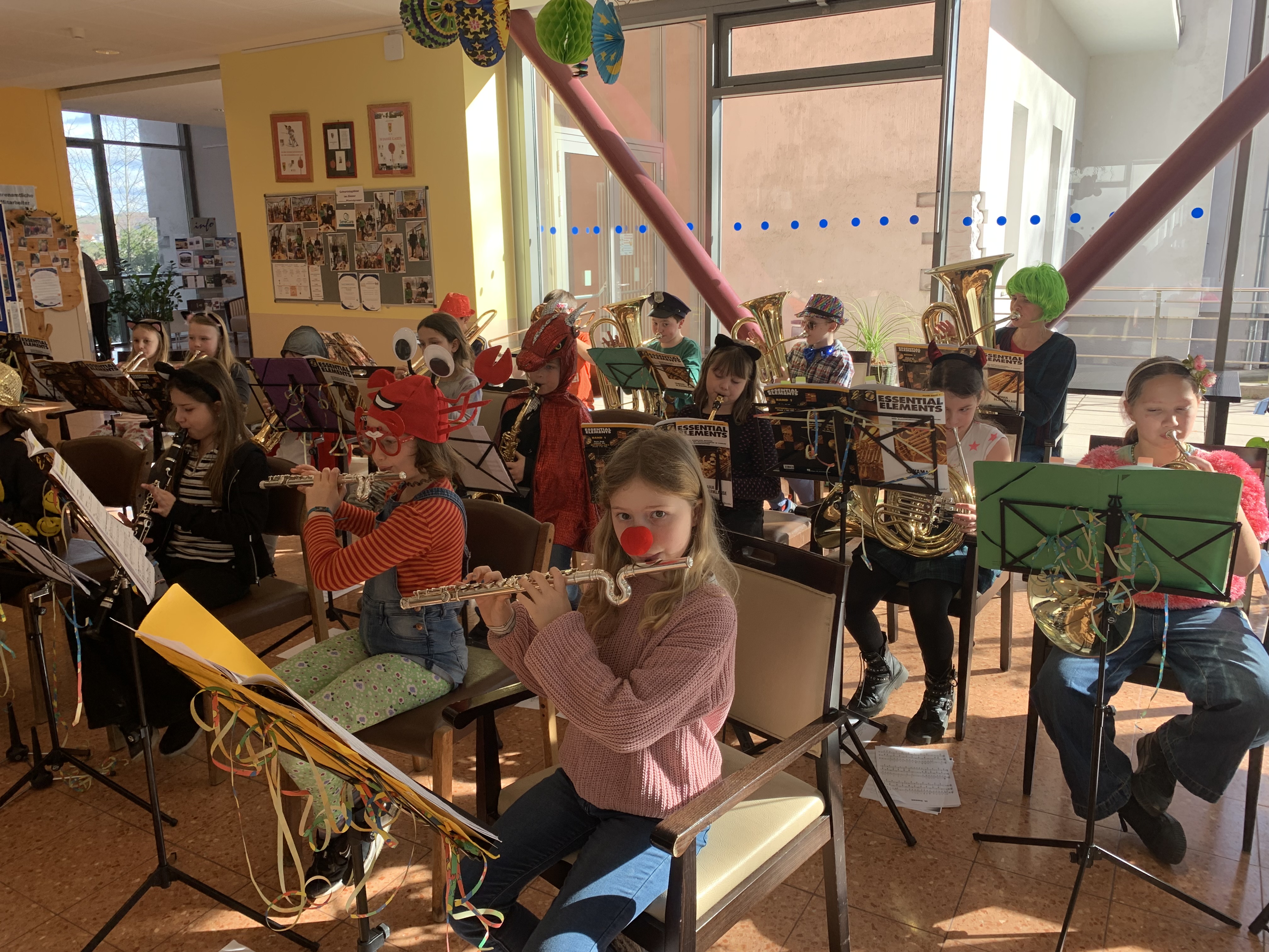 Im SeneCura Sozialzentrum Pressbaum spielten am Rosenmontag siebzehn lustig verkleidete Schülerinnen und Schüler des Bläserensembles der Musikschule Oberes Wiental in Kooperation mit der Volksschule Tullnerbach ein und flottes Programm an bekannten Melodien und Liedern. Die Lehrerinnen Carina Heindl und Julia Radner führten durch den abwechslungsreichen Reigen an Musikstücken, Witzen und Mitmachliedern und studierten sogar gemeinsam mit den Bewohnerinnen und Bewohnern einen Kanon ein. Frau Brandstätter wünschte sich, dass „Bruder Jakob“ auch in der Originalsprache gesungen wird und so wurde kurzerhand „Frère Jacques“ zu ihrer Freude auch auf Französisch gesungen. Den Höhepunkt erreichte das beschwingte Konzert als die Kinder selbstgemachte Faschingsbasteleien an das begeisterte Publikum verteilten und danach zu einem Mitmach-Quodlibet mit Gesang und rhythmischem Klatschen einluden. Als Dank für diese ganz besondere Darbietung gab es köstliche Faschingskrapfen, die die als Katzen, Clowns, Polizisten u.v.m. verkleideten Schülerinnen und Schüler gleich genüsslich schmausten.