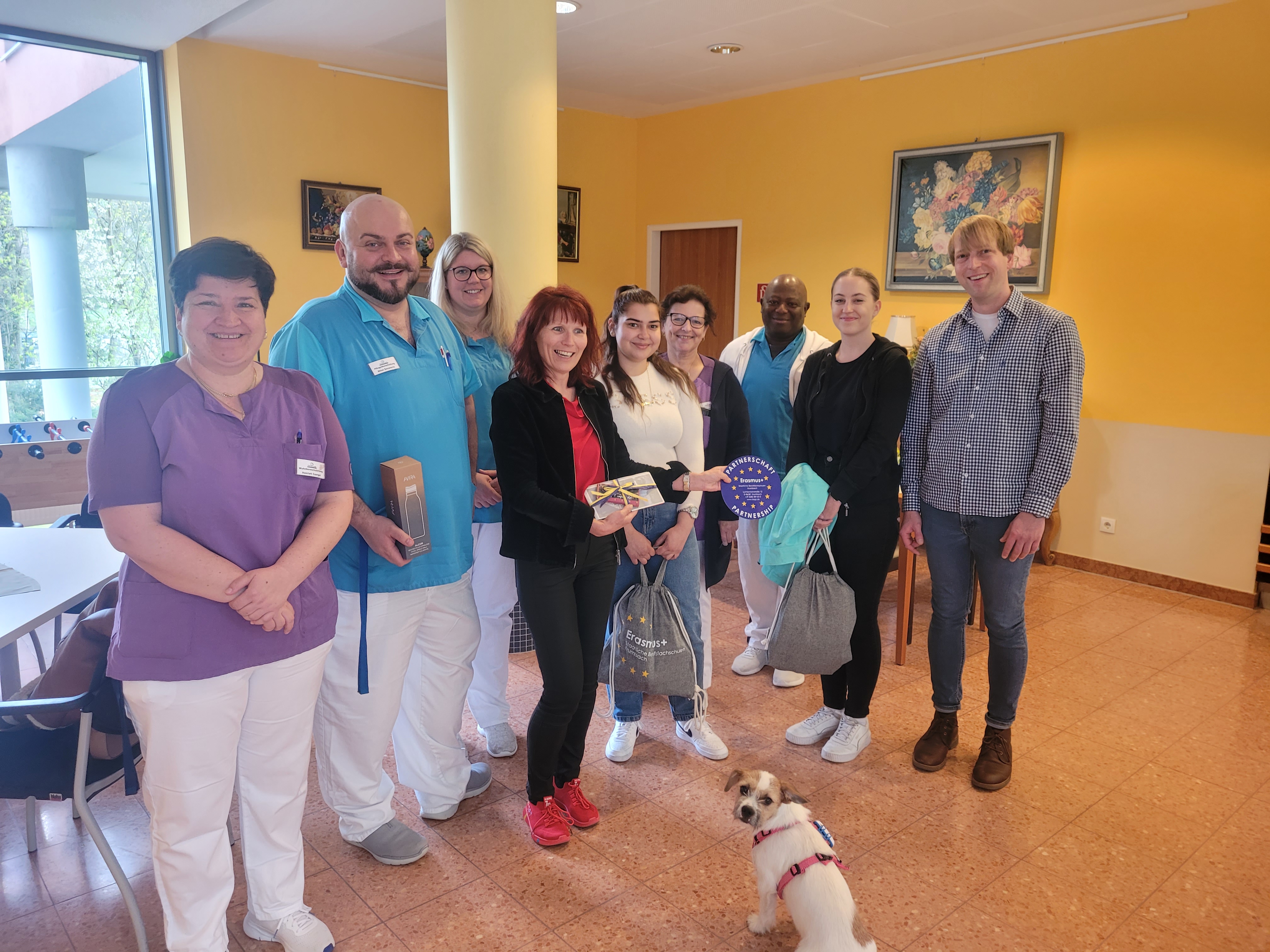 Renetea Zartova und Csenge Lehoczki leben in Bayern und machen dort eine zweijährige Ausbildung zum/zur „Pflegehelfer:in und Sozialbetreuer:in“. Während ihres Aufenthaltes sollen sie möglichst viel Einblick in die Bereiche Pflege und Sozialbetreuung erhalten. Die zwei jungen Leute sind von der morgendlichen Dienstübergabe bis zum Nachmittag in den Wohnbereichen und begleiten jeweils eine Pflegekraft und übernehmen teilweise auch Aufgaben in diesem Bereich. Außerdem nehmen sie an den verschiedenen Beschäftigungsangeboten teil. So bekamen sie die Möglichkeit, bei Motogeragogikstunden, bei der Bewegungsrunde, beim musikalischen Nachmittag, beim Demenztraining sowie bei einem Besuch von Therapiehunden mit dabei zu sein. Als Abschluss leiteten sie selbstständig eine Motogeragogikstunde und ein Demenztraining an. Beides haben sie sehr gut gemeistert und sowohl die Bewohner:innen als auch ihre Betreuerin waren sehr zufrieden mit ihren Leistungen. Auch Lehrerin Julia Mändle nutzte die Zeit, um Einblicke in die österreichischen Tagesabläufe vor allem in der Sozialbetreuung zu bekommen. Aus Sicht des Pressbaum-Teams haben sich alle Beteiligten sehr interessiert gezeigt und besonders netten Kontakt zu Bewohner:innen und unseren Mitarbeiter:innen aufgebaut.