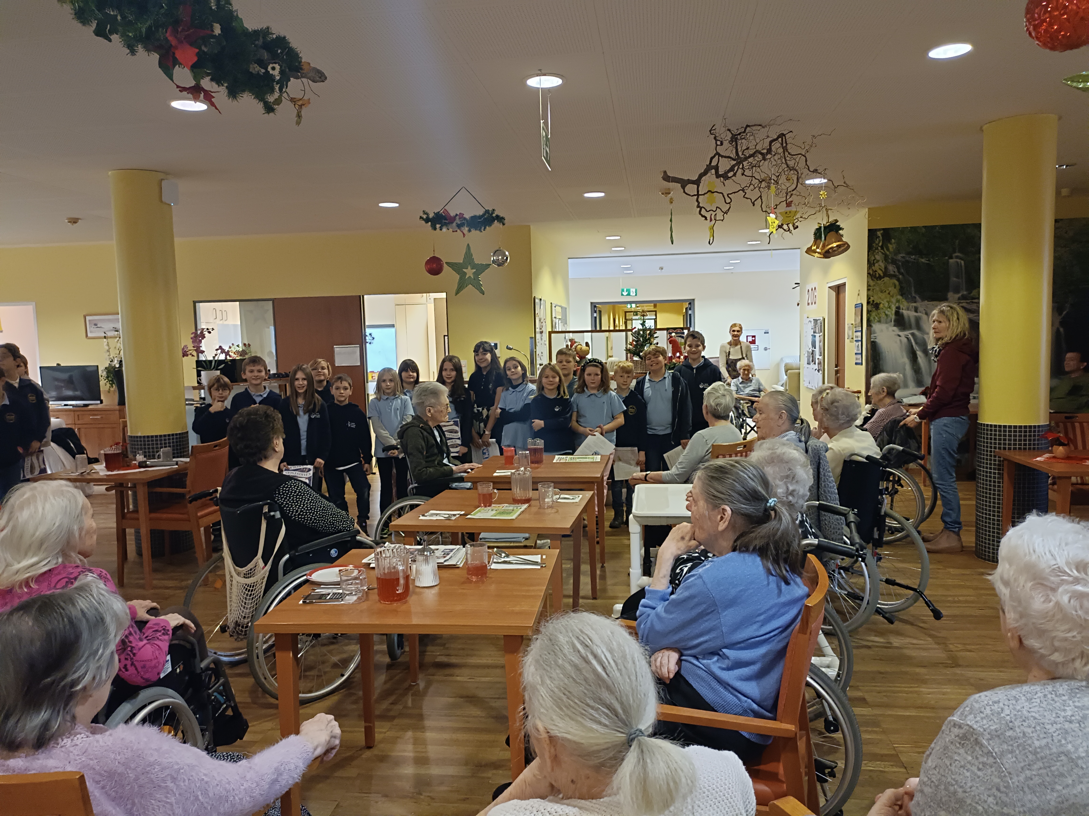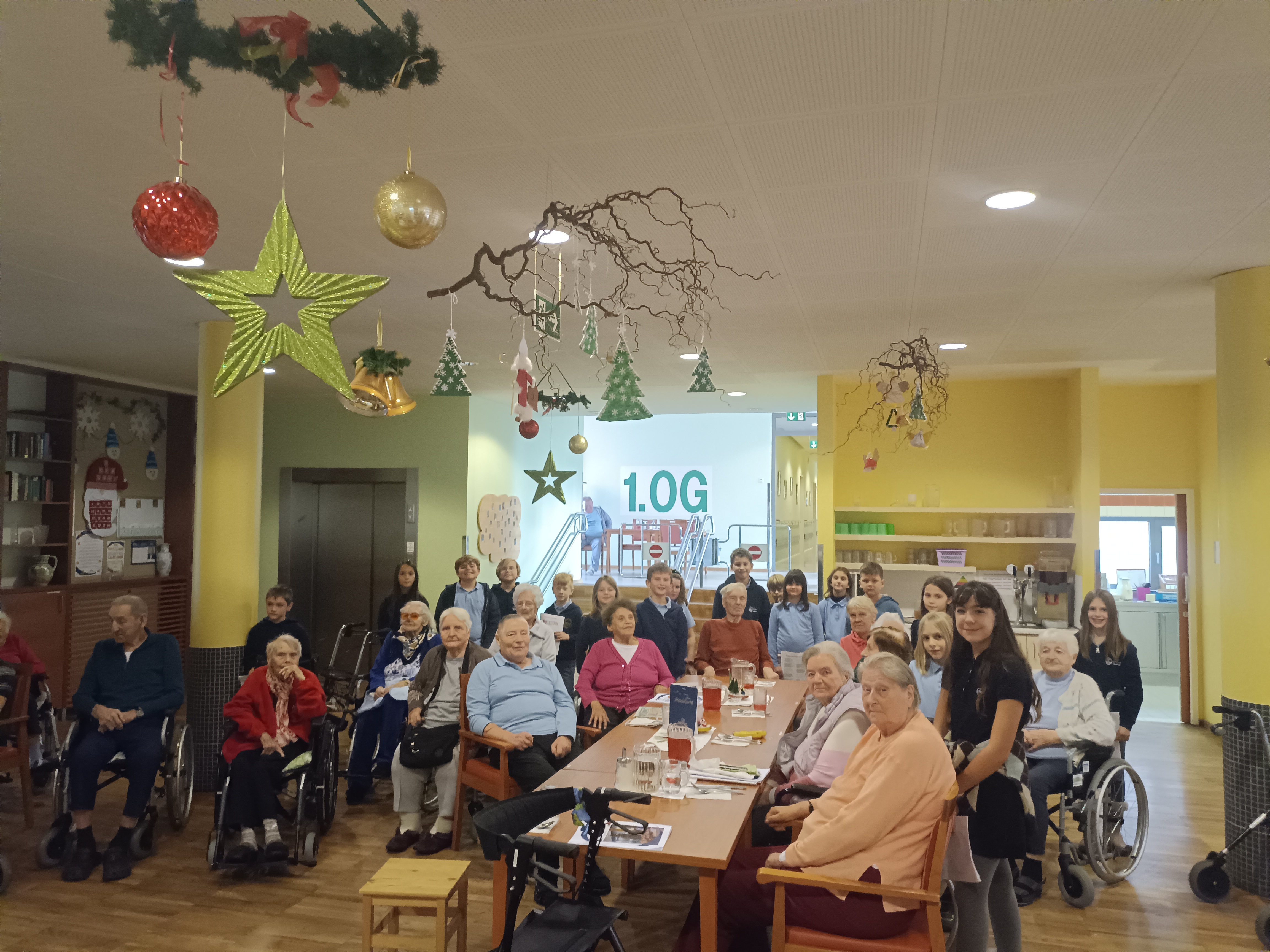 Zwanzig Mädchen und Buben kamen bei schönem Wetter von ihrer Schule herbeispaziert und gaben für die Bewohner:innen aller Wohnbereiche schwungvolle Weihnachtslieder zum Besten, trugen Gedichte vor und wünschten den begeisterten Zuhörer:innen frohe Weihnachten.