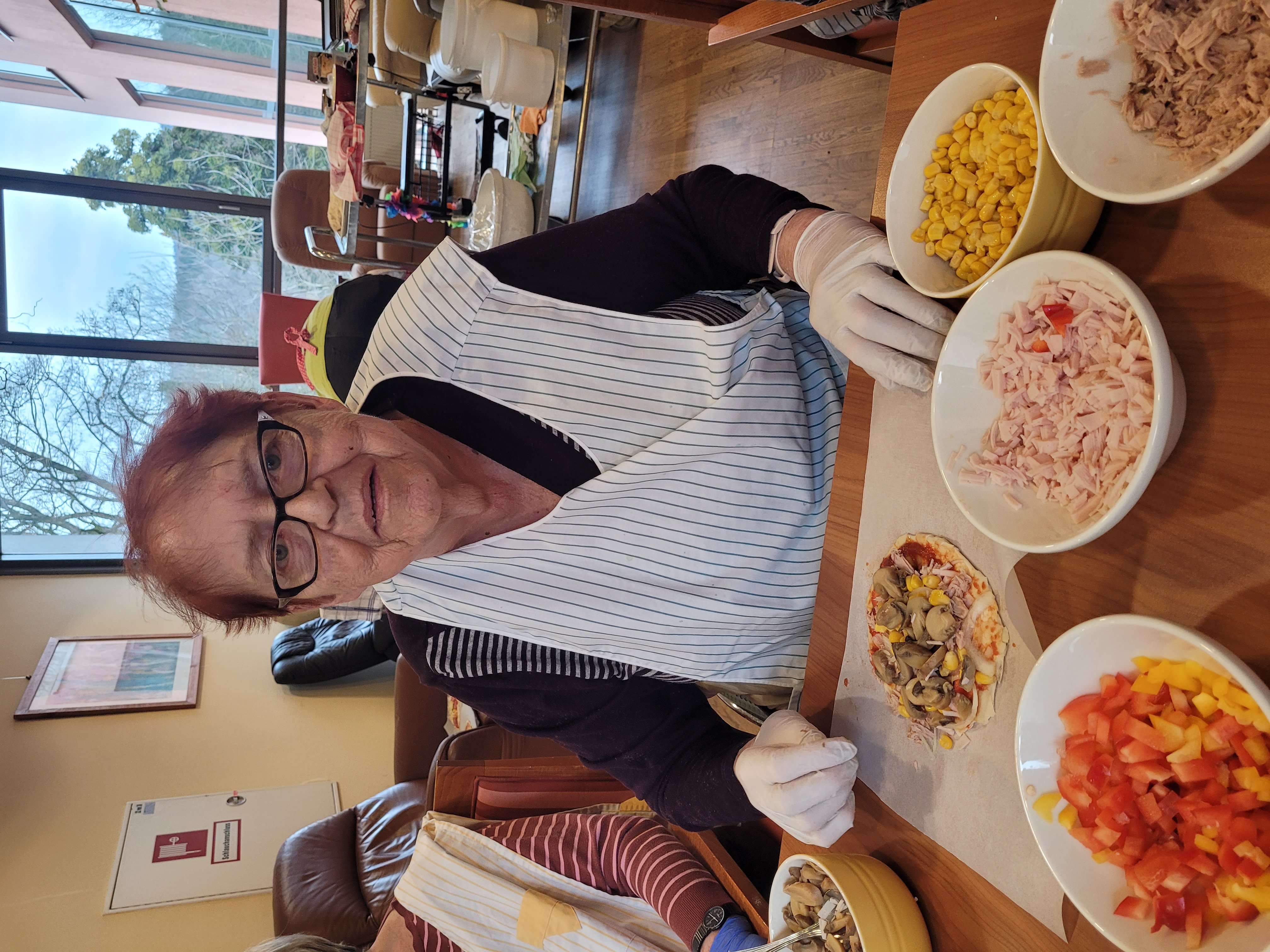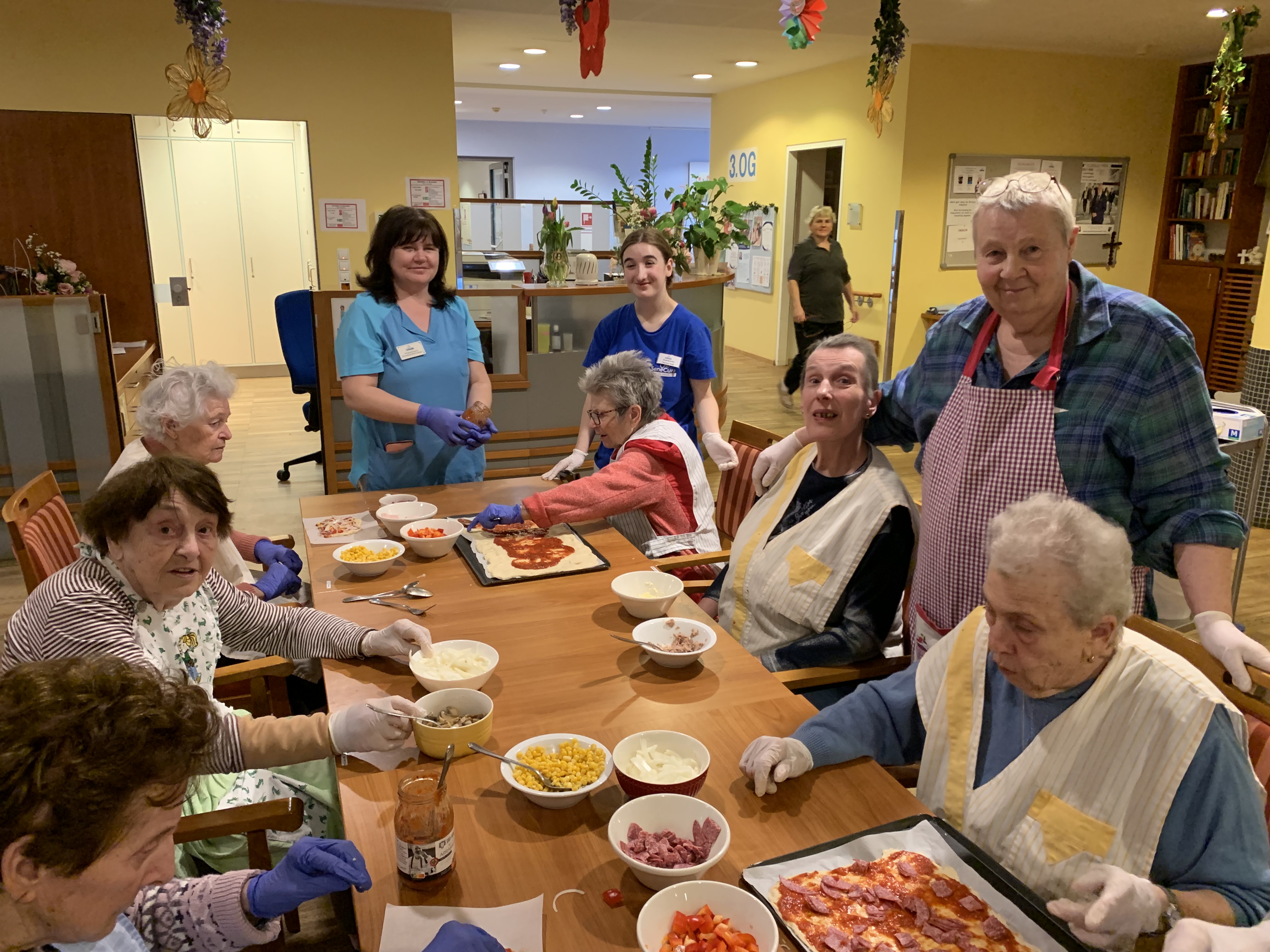 Das SeneCura Sozialzentrum Pressbaum verwandelte sich kürzlich in ein herrlich duftendes Pizzarestaurant. Nachdem der Teig von den ehrenamtlichen Mitarbeiterinnen, Tina, Sigrid und Ulrike, selbst zubereitet wurde, kamen zehn fleißige Pizzabäcker:innen ins Spiel. Eifrig wurden die Teiglinge in Form gebracht und sorgfältig mit pikanter Tomatensauce bestrichen. Danach durften alle ihre Pizza nach Vorliebe mit Thunfisch, Schinken oder Salami, sowie mit Mais, Paprika, Zwiebel und Champignons belegen. Zum Schluss wurden noch reichlich Pizzakäse und italienische Kräuter draufgestreut und anschließend wurden die fertigen Pizzen im Ofen knusprig gebacken. Währenddessen bereiteten die ehrenamtlichen Helferinnen gemeinsam mit den Bewohner:innen und den Seniorenbetreuerinnen noch viele liebevoll belegten Pizzen zu, damit auch alle anderen Senior:innen mit köstlich duftender Pizza verwöhnt werden konnten.