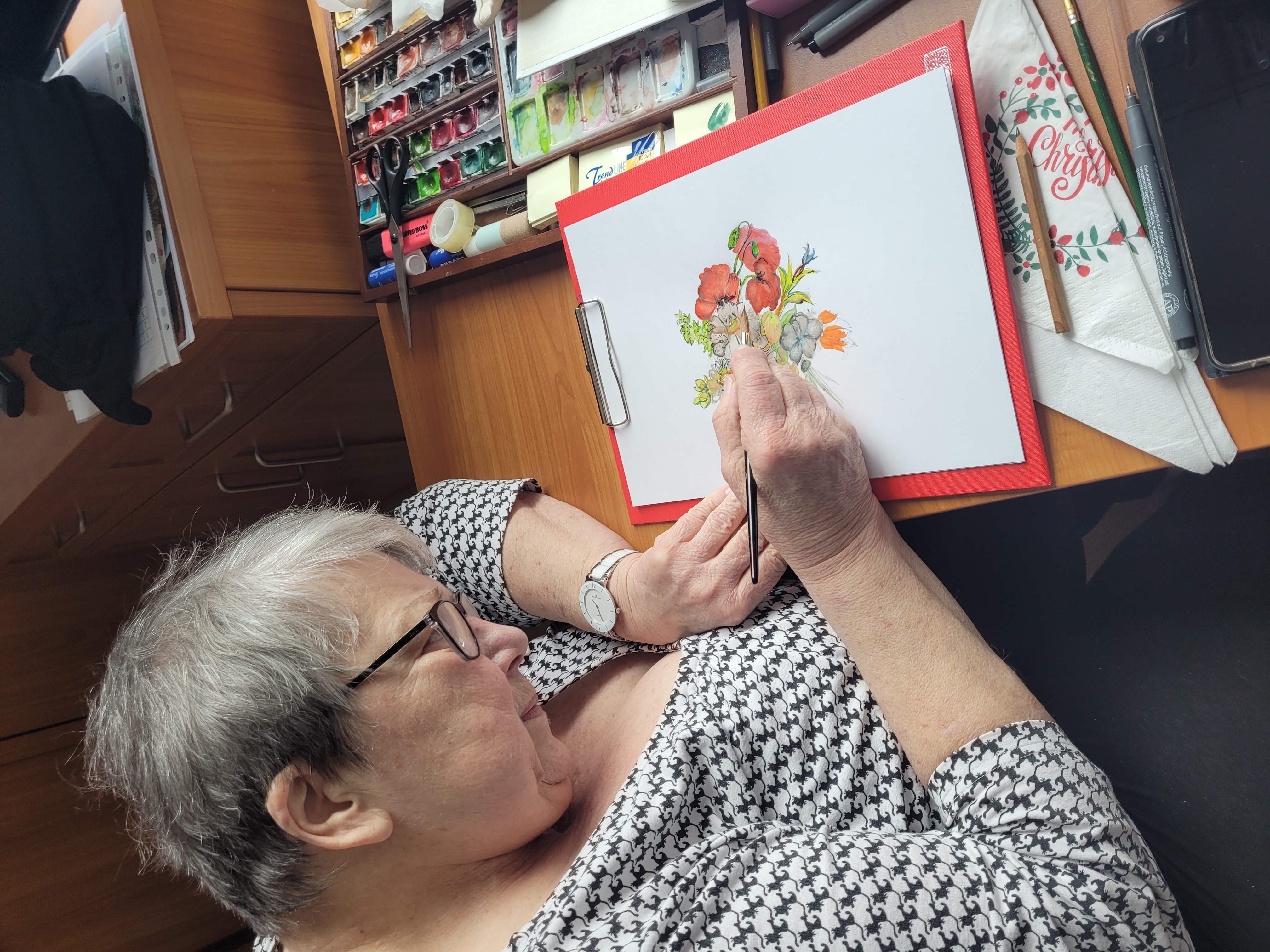 Im SeneCura Sozialzentrum Pressbaum hat die Bewohnerin, Elfriede Skopek, ihr eigenes kleines „Atelier“ eingerichtet. Die Künstlerin hat 38 Jahre lang in der bekannten Porzellanmanufaktur Augarten als Porzellanmalerin gearbeitet und war dort unter anderem auch zuständig für die Ausbildung der Lehrlinge. Nach ihrer Pensionierung machte sie ihren ehemaligen Beruf zum Hobby und begann sich intensiv mit Kunstmalerei auseinanderzusetzen. Das Ergebnis sind bezaubernde Bilder, von denen nun über 30 Stück die Gänge der Wohnbereiche zieren. Frau Skopeks Lieblingsmotive sind Blumen, aber auch Vögel und andere Tiere, sowie Elfen malt sie mit viel Liebe und großem Können. Die Seniorenbetreuerinnen besorgten sogleich hübsche Rahmen und passten die Bilder an, wodurch deren Schönheit noch mehr zur Geltung kommt.