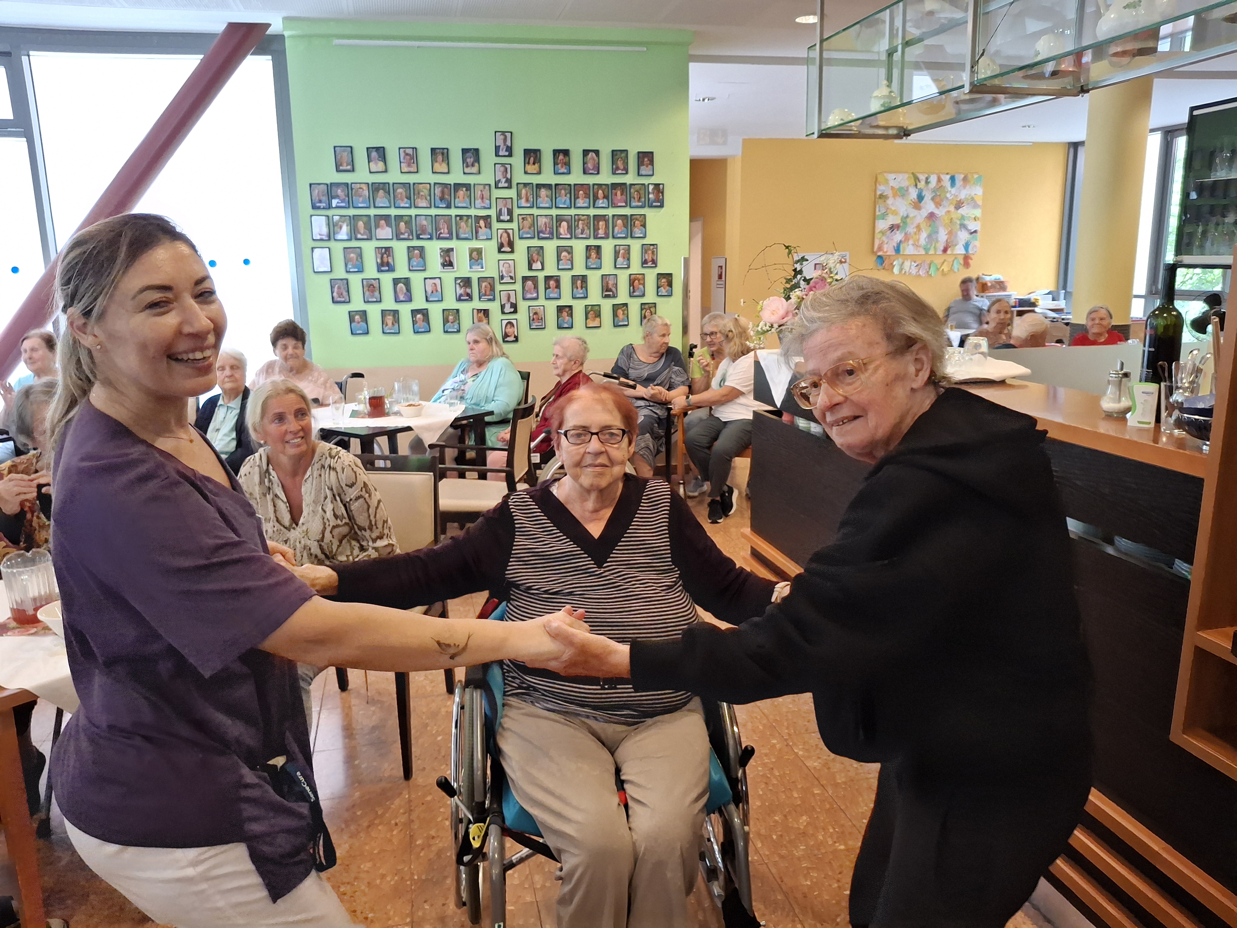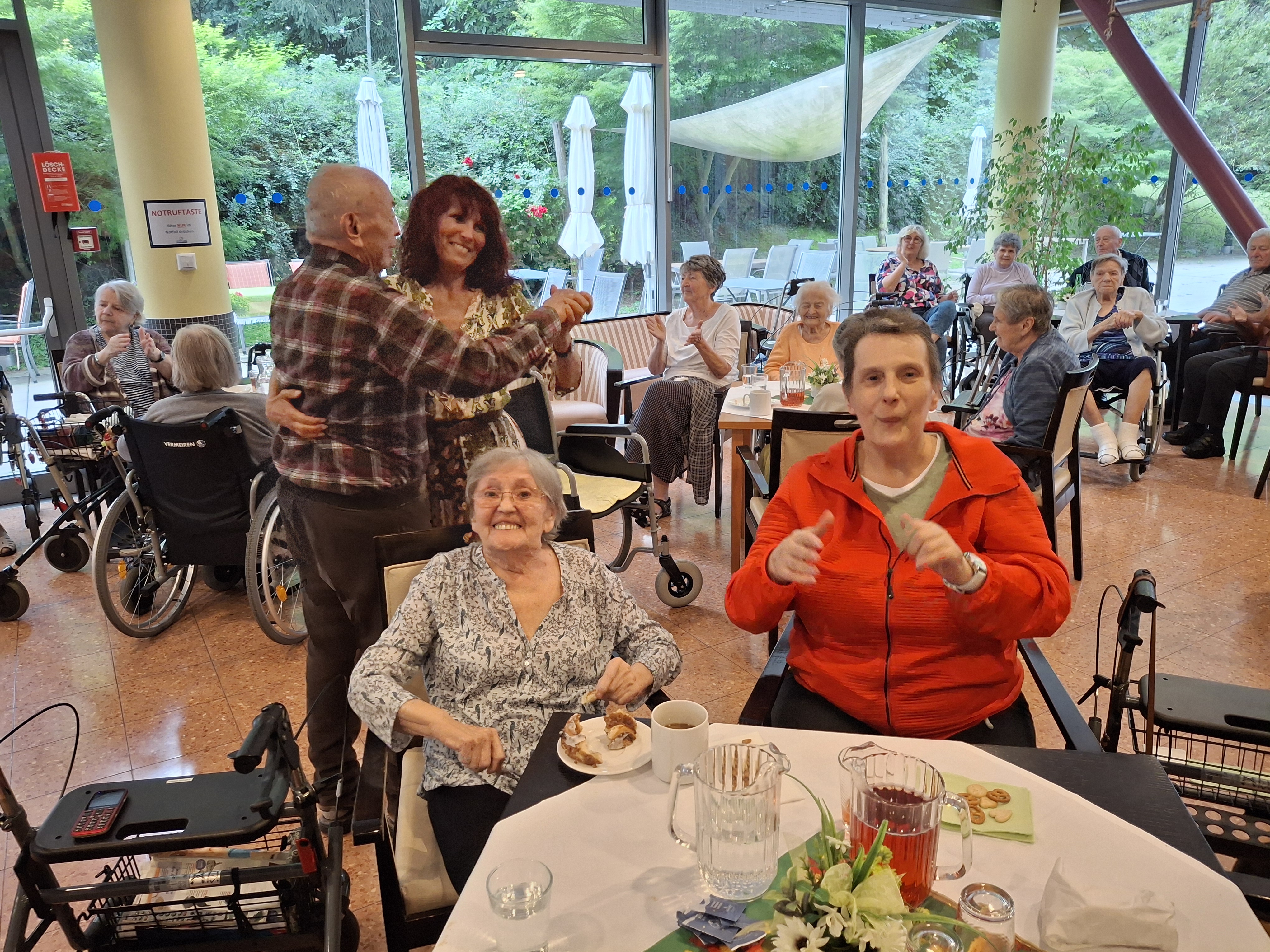 Die Bewohner:innen freuten sich über ein beschwingtes Tänzchen und alle Gäste klatschten und schunkelten begeistert mit. Im Anschluss an das fantastische Konzert stärkten sich alle gemeinsam mit einer zünftigen Jause. Hausleitung Martina Frau Schmit bedankte sich bei allen, die zu diesem besonderen Konzertnachmittag beigetragen haben und lud „Die Hochstraßer“ dazu ein, bald wieder im Haus zu musizieren.