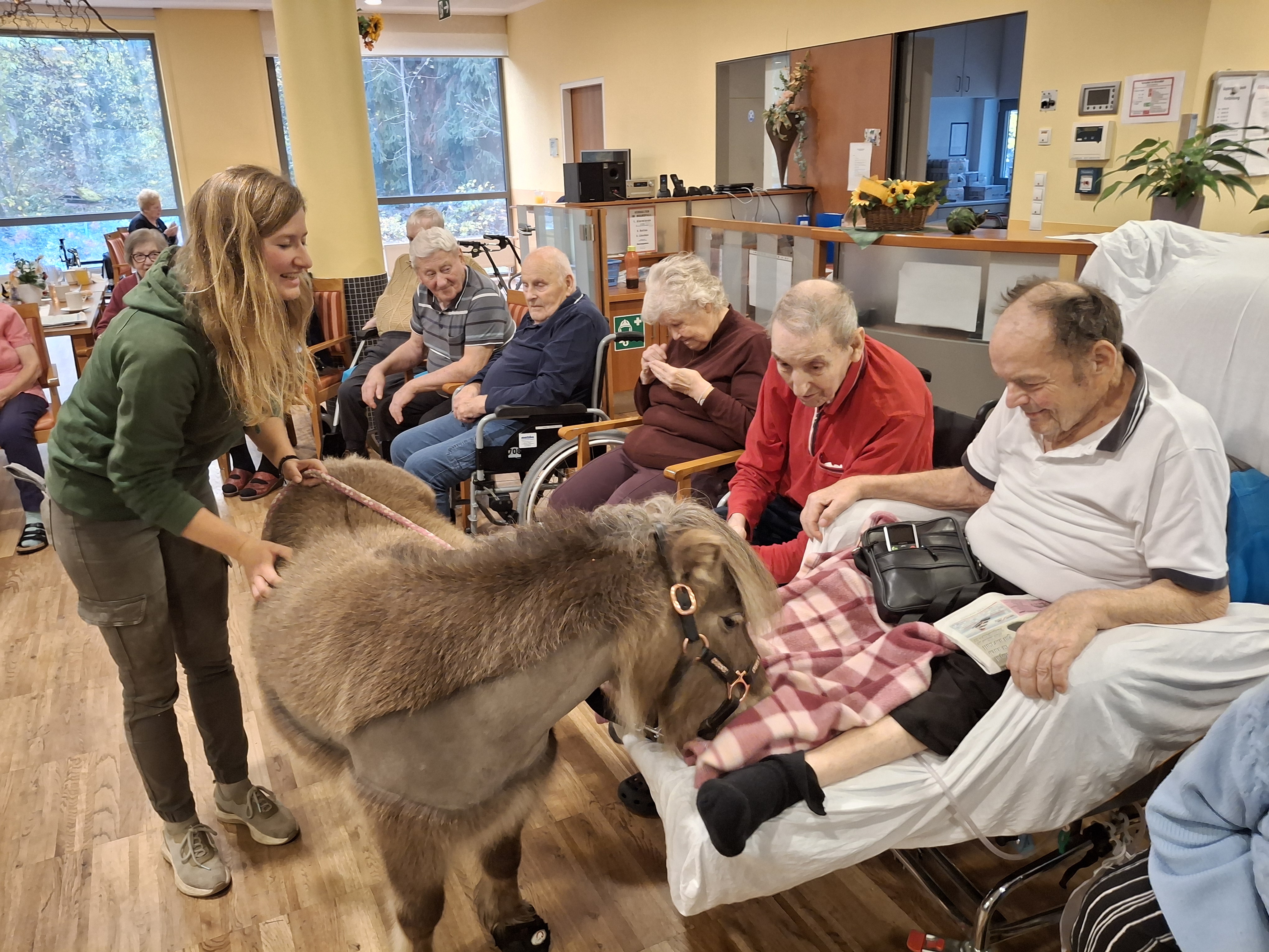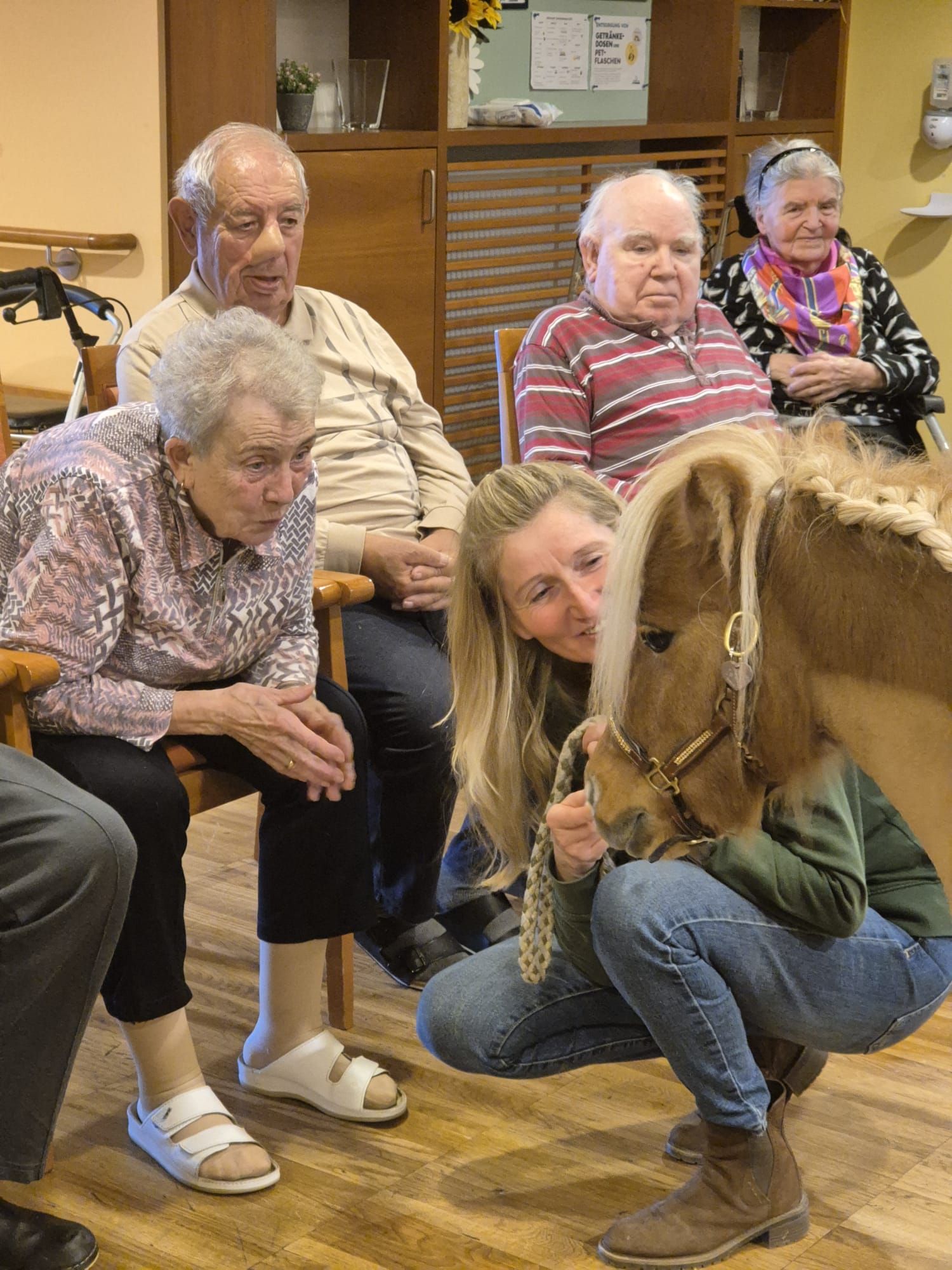 Für die Bewohner:innen war es ein Erlebnis für alle Sinne: Es wurde dem Trappeln der Hufe und dem Schmatzen beim Füttern gelauscht, Mensch und Tier beschnupperten einander und die Shettys wurden aufmerksam beobachtet und bestaunt.